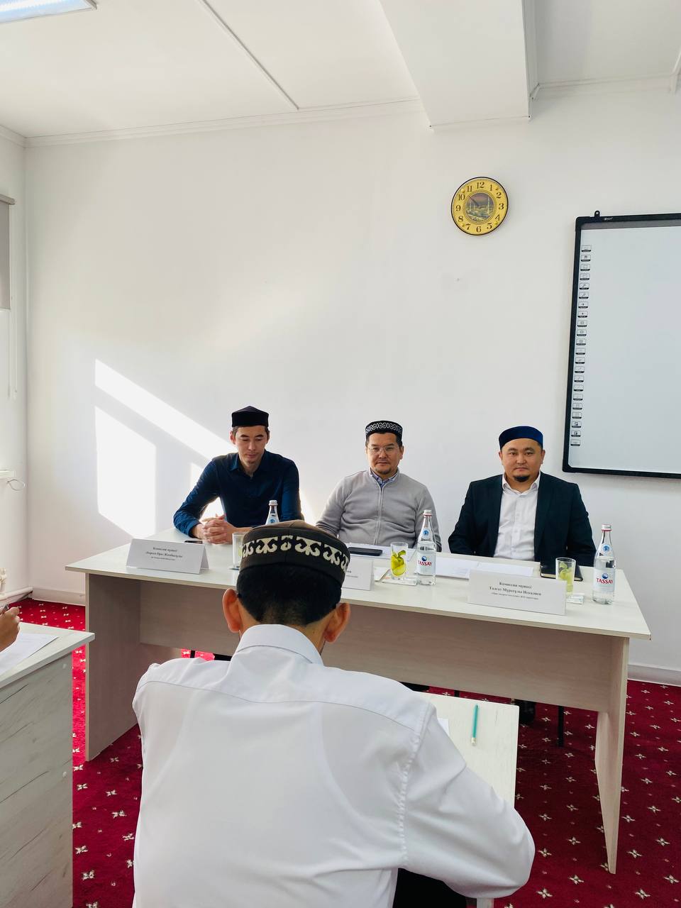 Емтихан комиссиясына Қазақстан мұсылмандары діни басқармасының Діни білім және кадр дайындау бөлімінің меңгерушісі Хасан Аманқұлов төрағалық етті. Сондай-ақ комиссия құрамында «Ар-Рахман» мешітінің наиб имамы Бағдат Шақаев пен медресе-колледждің ұстазы Махмед Серік болды.